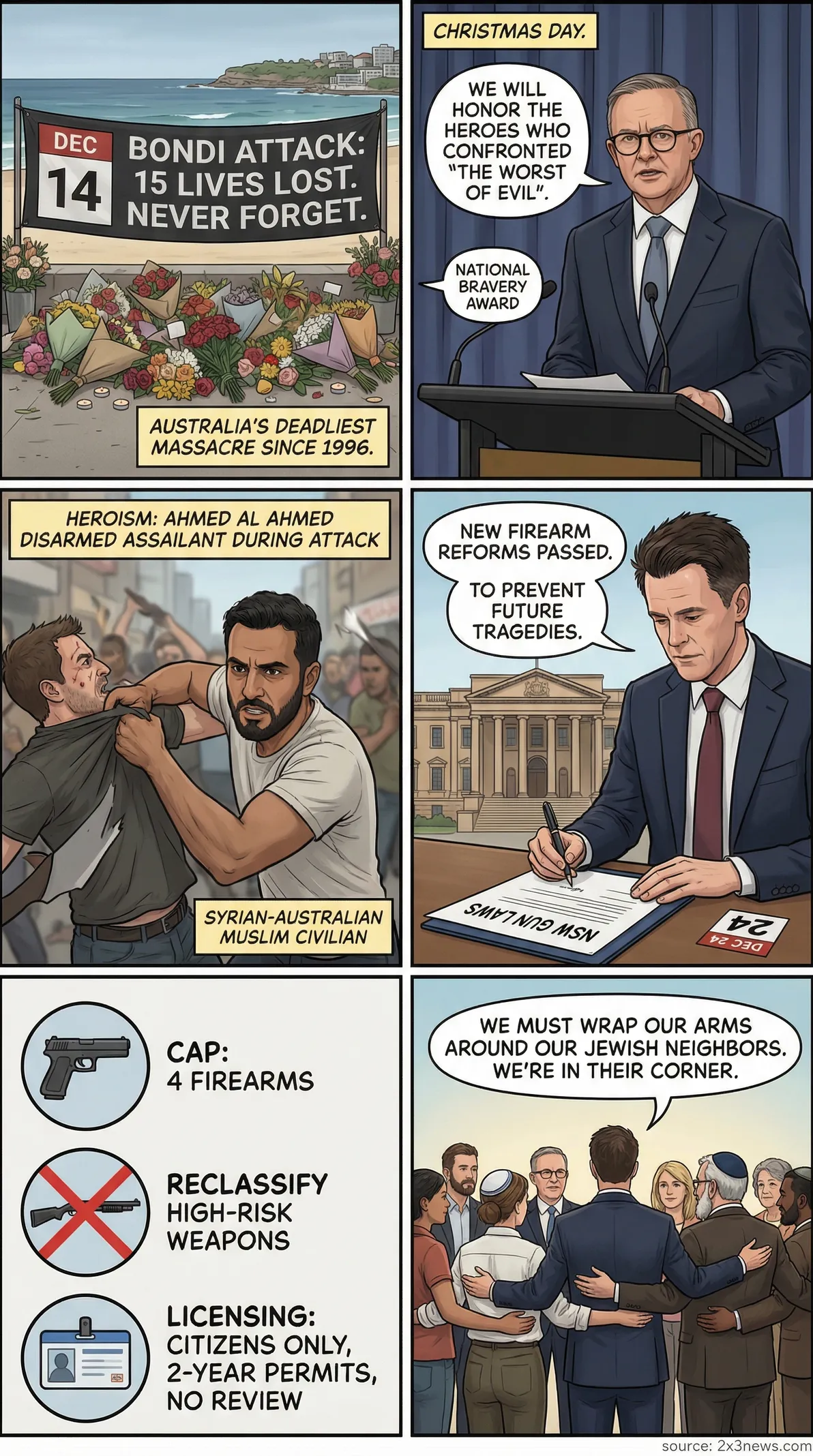 PM Albanese announced national bravery awards for heroes of the Bondi antisemitic terror attack. New South Wales also tightened firearm laws in response to the massacre.