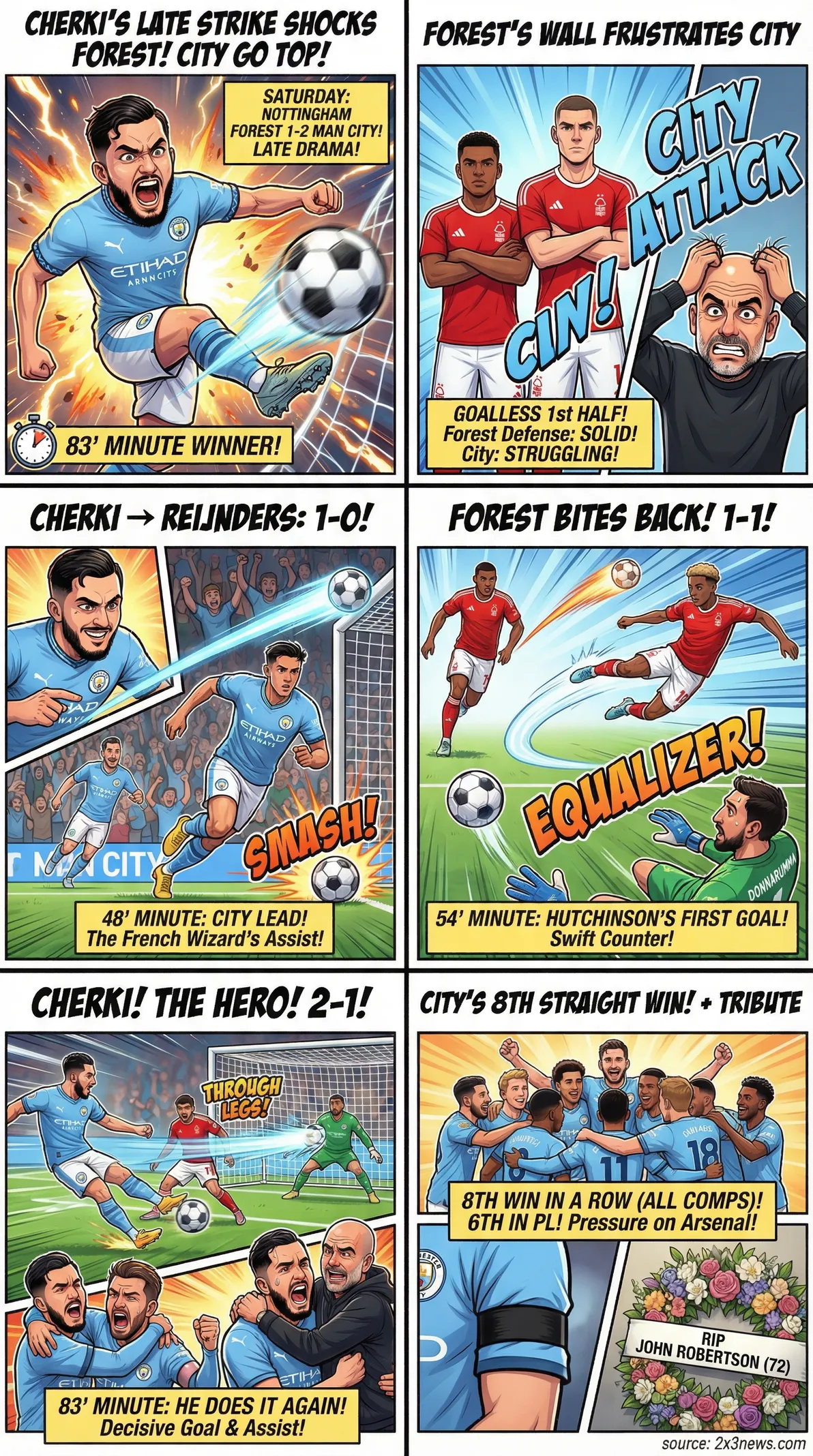 - •Manchester City defeated Nottingham Forest 2-1, with Rayan Cherki scoring the winning goal and assisting the opener.