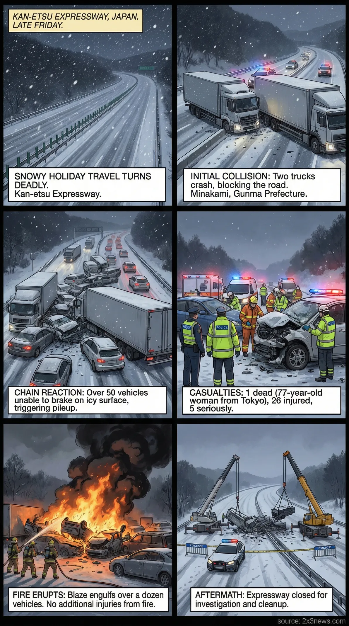 - •The crash involved over 50 vehicles and occurred late Friday in snowy conditions, coinciding with the start of Japan's year-end holiday season.