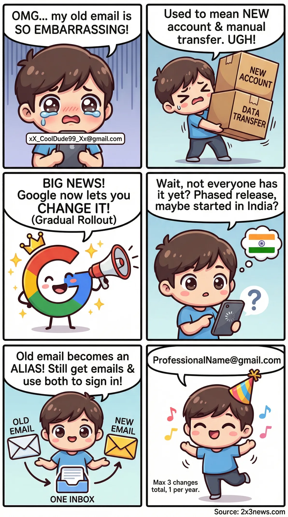 Got a Gmail ID that makes you cringe? Google is finally letting you change it↗Google To Let Users Change Gmail Address -- What You Need To Know↗Google is rolling out a new feature allowing users to change their Gmail address↗This Gmail update will end years-long frustration over fixed email addresses -- here's what Google is planning | Mint↗Gmail might finally let you switch to a new address without starting over↗