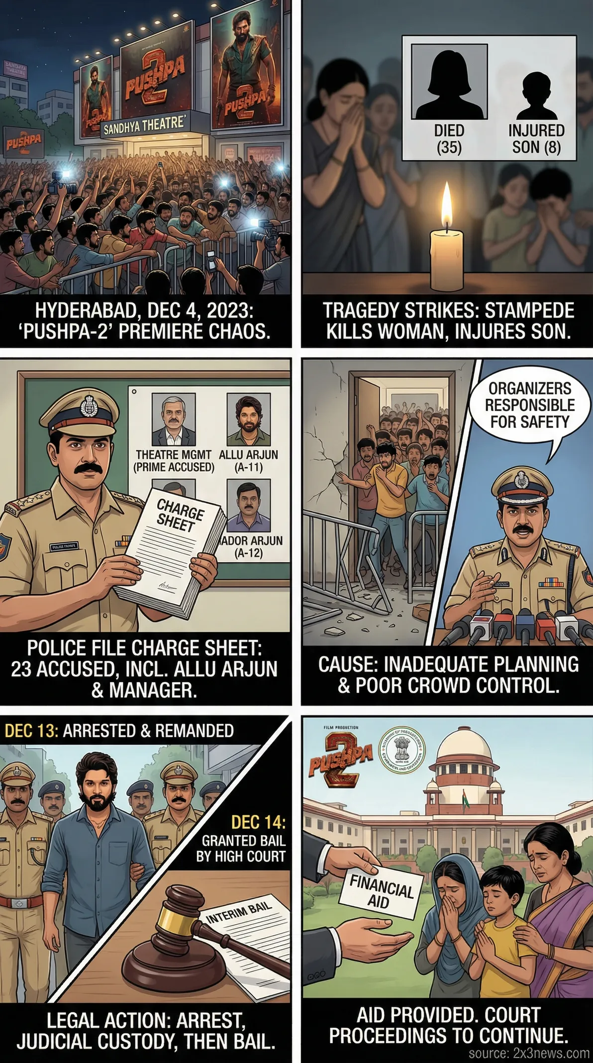 - •Hyderabad police filed a charge sheet against 23 individuals, including actor Allu Arjun, in a fatal stampede case.