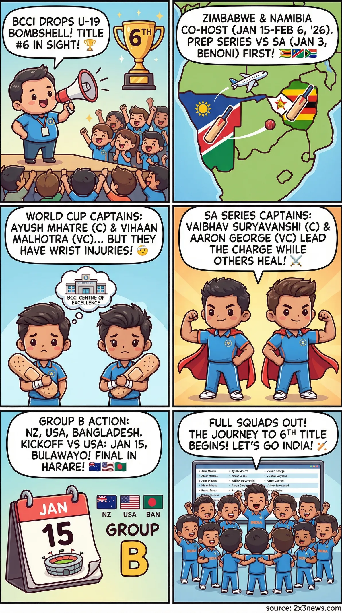 BCCI announces India's U-19 World Cup squad for 2026, with Ayush Mhatre as captain. Vaibhav Suryavanshi leads SA tour. India aims for sixth crown.
