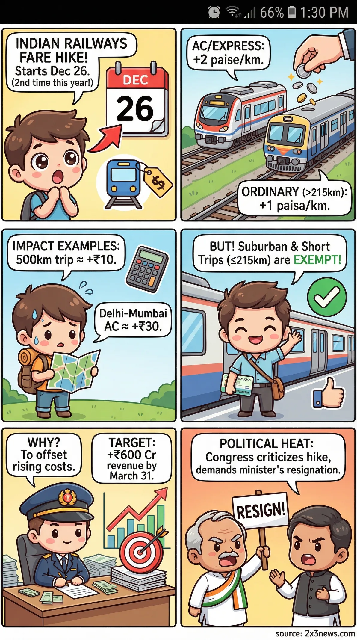 Indian Railways to hike ticket prices from Dec 26, estimates Rs 600 cr revenue gain↗Indian Railways fare hike from December 26: How much more will you pay?↗Railways to hike passenger fares from Friday; eyes Rs 600 cr revenue in coming months↗Ashwini Vaishnaw should resign over Railways deterioration: Congress after train fare hikes↗Rail ticket prices go up from Dec 26: Here's the new fare math↗