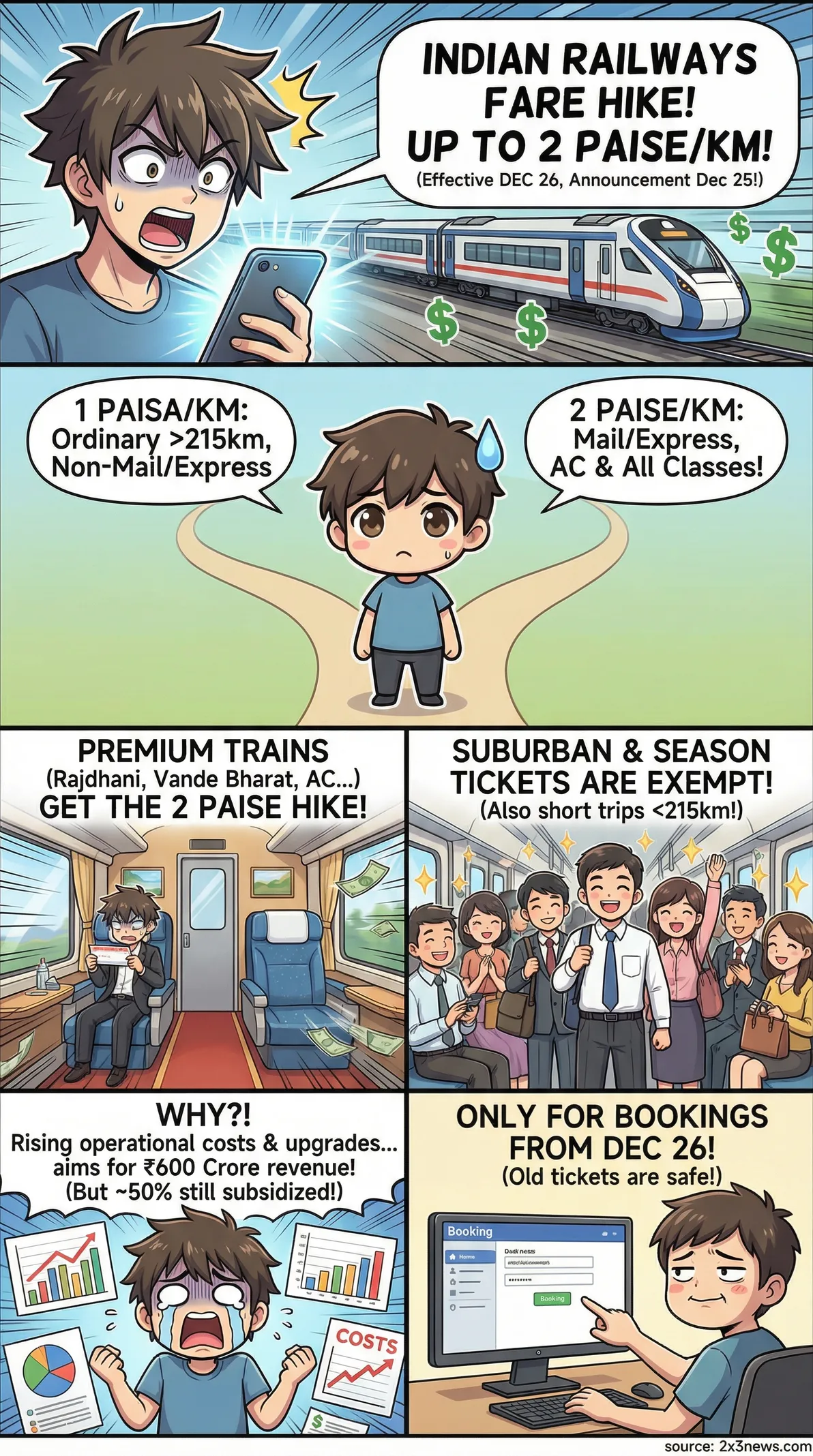 Indian Railways implements a nationwide fare hike of up to 2 paise per km, effective December 26. Learn about new ticket prices, affected routes, and the reasons behind the increase.