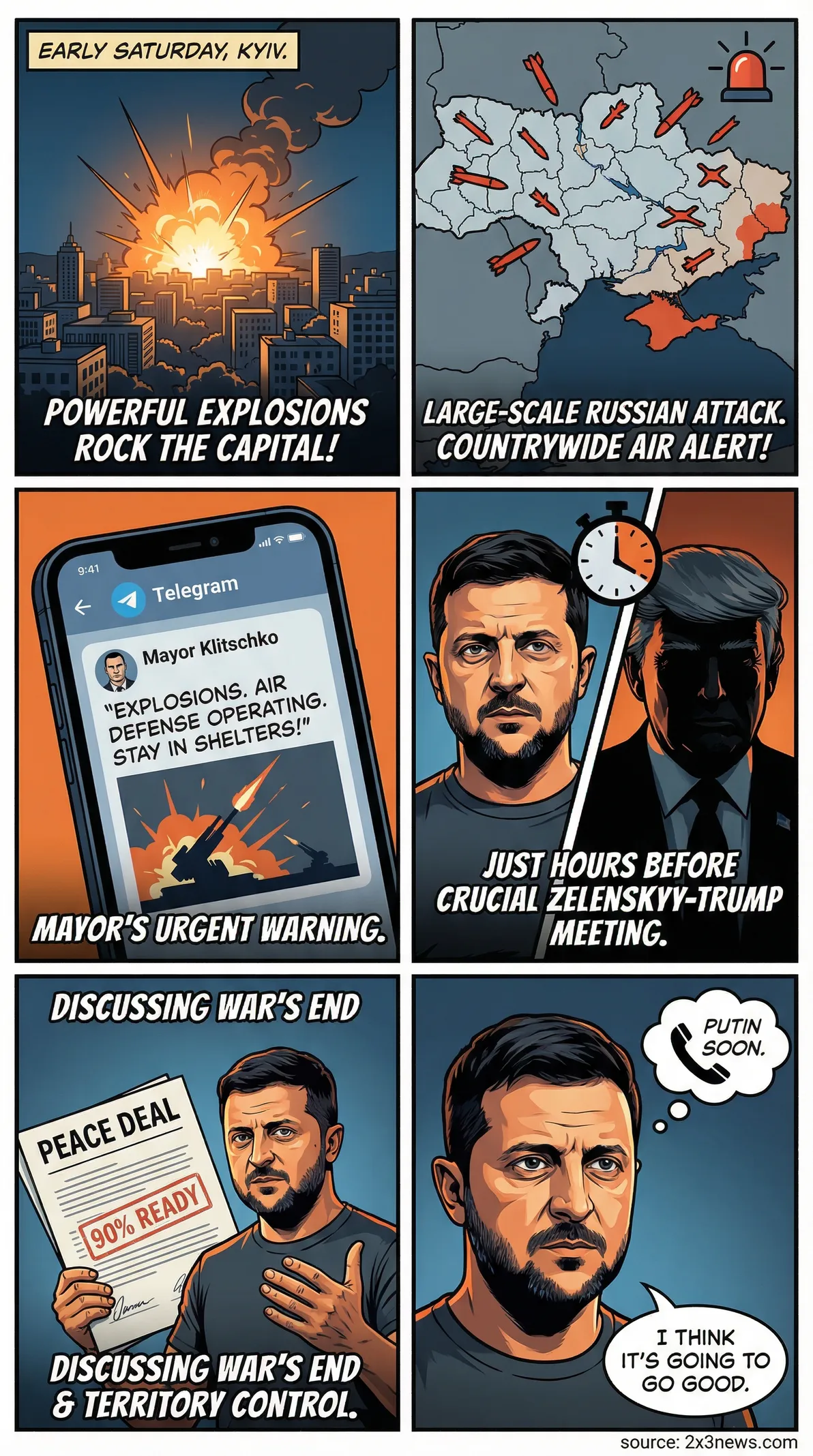 Powerful explosions hit Kyiv and other Ukrainian regions in a large-scale Russian attack ahead of a key meeting between Zelenskyy and Trump.