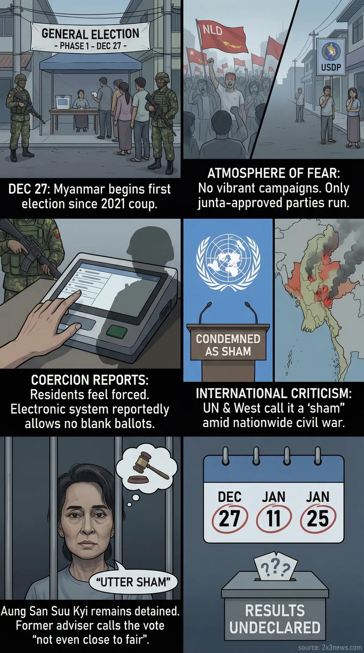 Myanmar begins its first general election since the 2021 coup, facing international condemnation, civil war, and allegations of being a sham to entrench military rule.