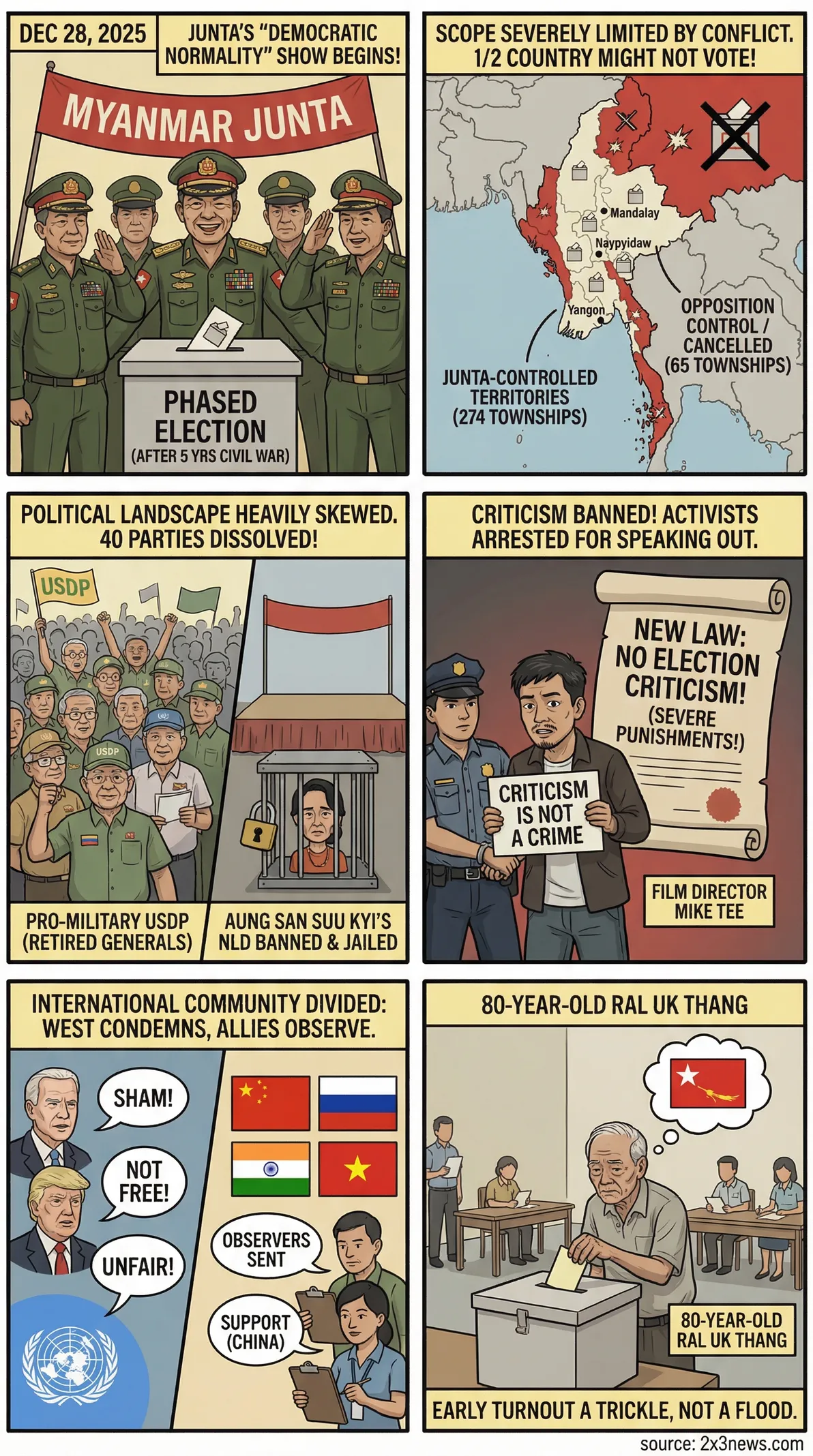 - •Myanmar's military junta began a phased election on Sunday, December 28, 2025, five years after its 2021 coup.