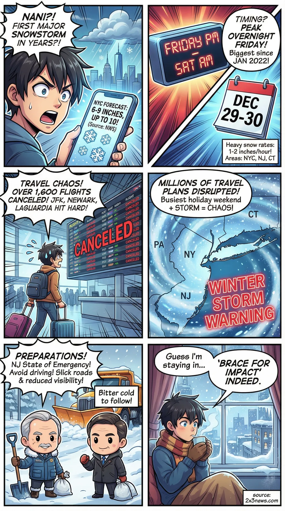 New York City and surrounding areas prepare for 6-10 inches of snow, causing thousands of flight cancellations and travel disruptions during the busy post-Christmas holiday weekend.