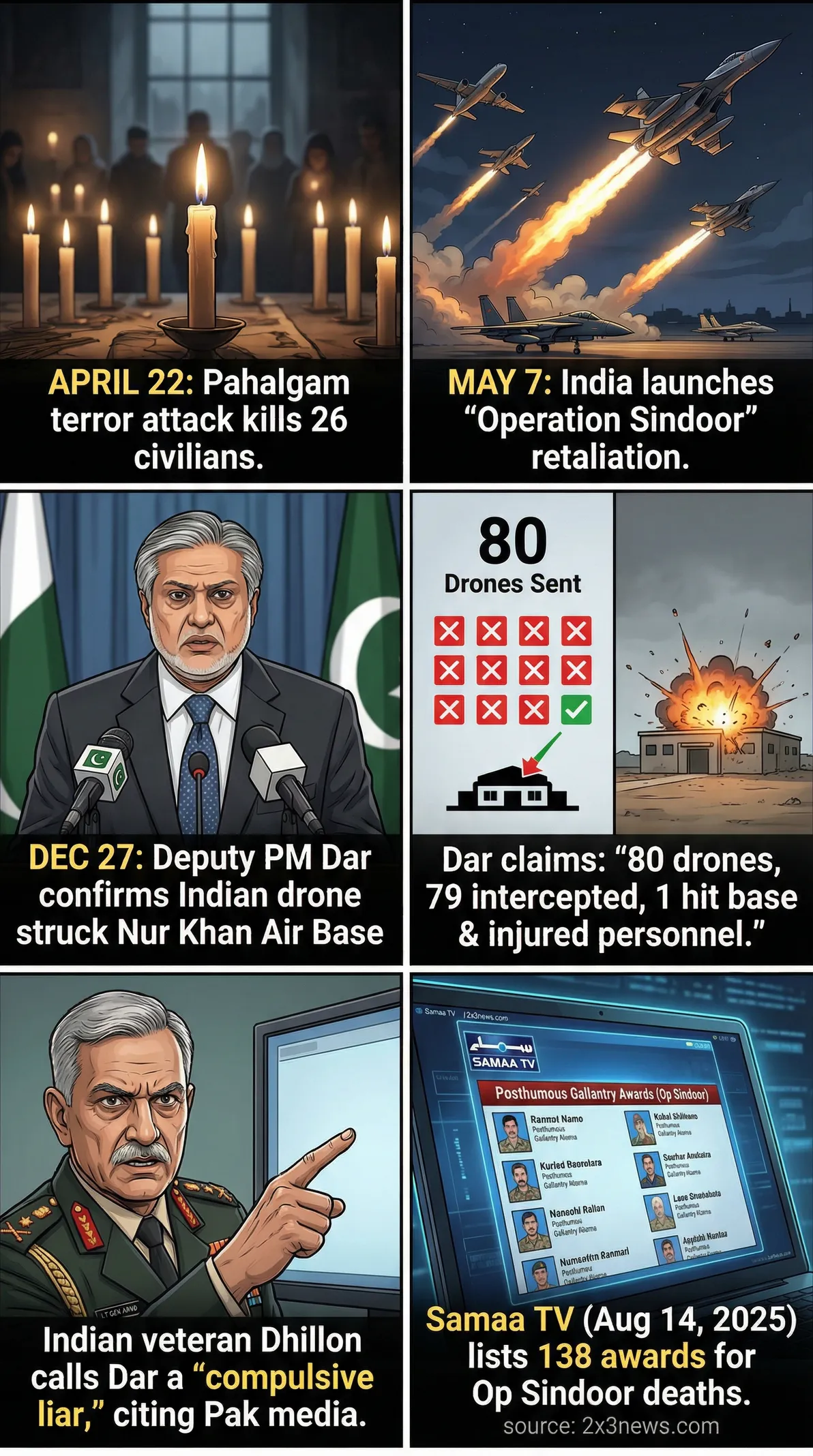 - •Dar claimed 79 out of 80 Indian drones were intercepted, with only one hitting the base.