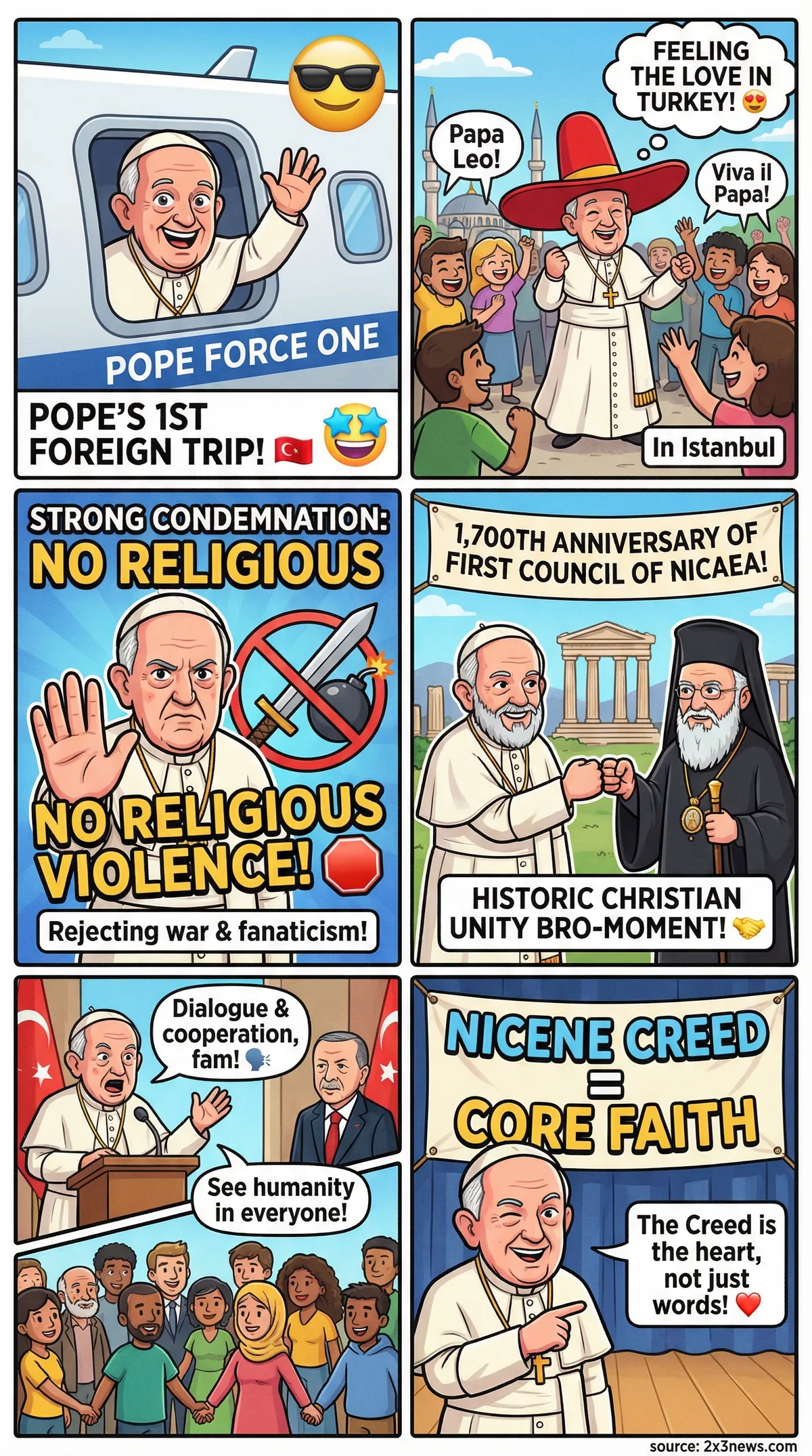 Pope Leo XIV, on his first trip to Turkey, condemned the use of religion to justify violence and fanaticism, calling for unity and dialogue during the 1,700th anniversary of the Council of Nicaea.