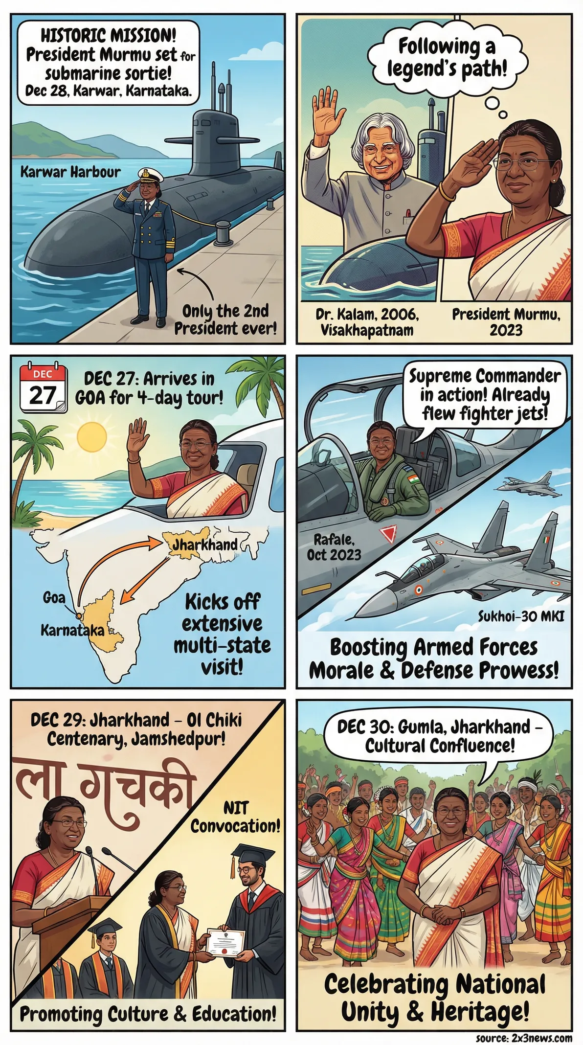 President Droupadi Murmu will become India's second President to travel in a submarine on Dec 28 from Karwar, Karnataka, continuing her engagement with armed forces.