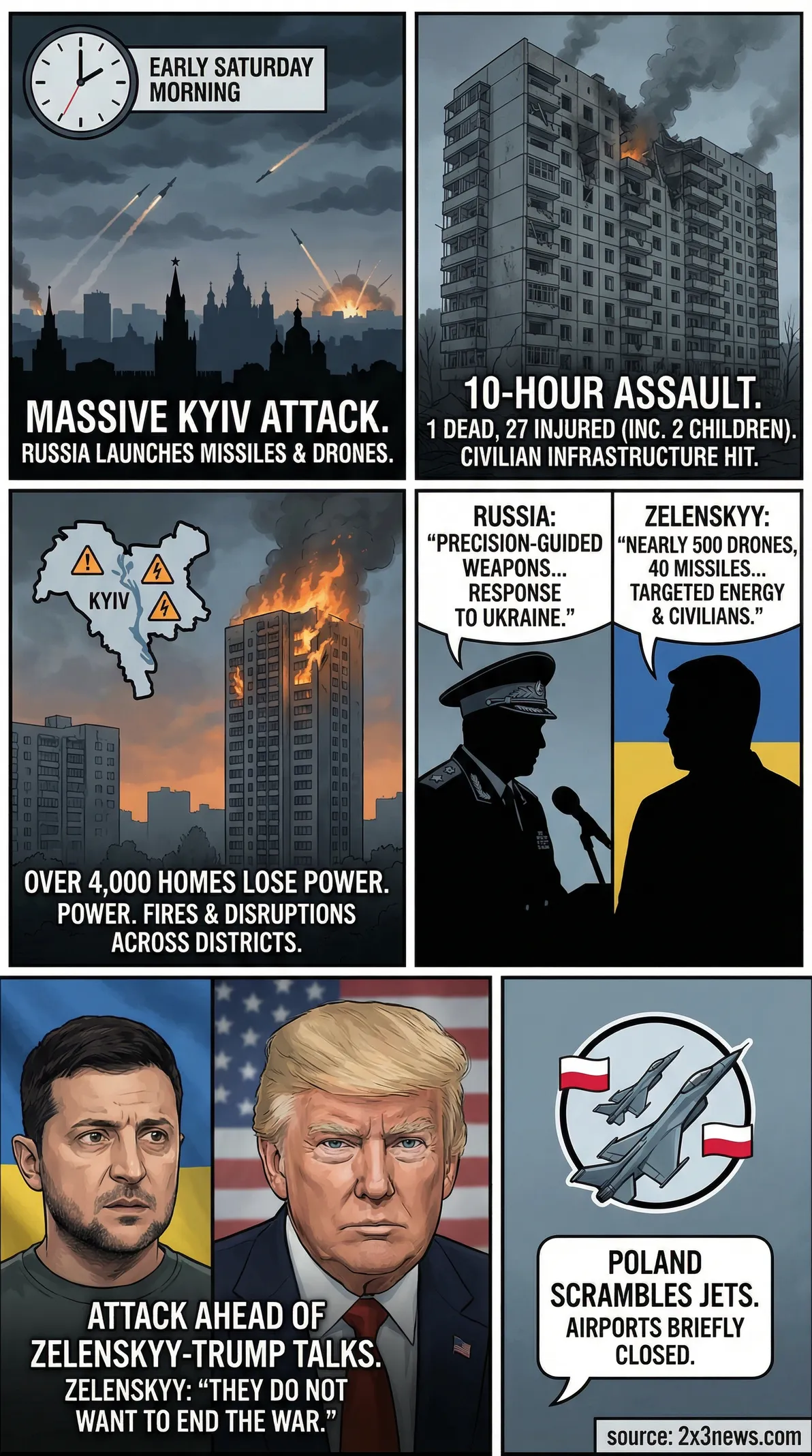 Russia launched a massive missile and drone attack on Kyiv, killing one and wounding 27. The assault precedes crucial Ukraine-US talks on security.