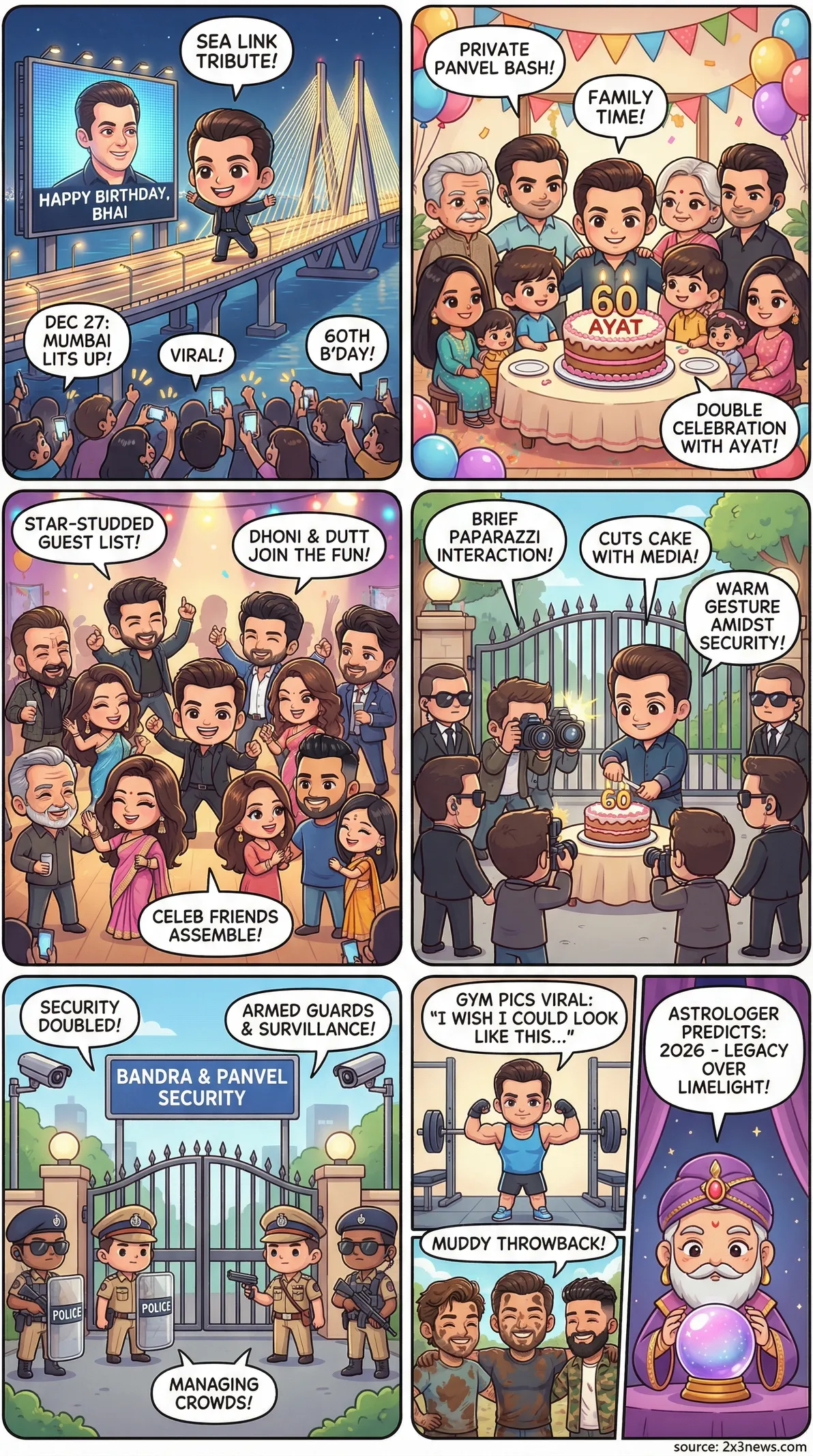 Salman Khan turns 60: Mumbai's Bandra-Worli Sea Link lights up in tribute to star's birthday↗Salman Khan's throwback photo with MS Dhoni and AP Dhillon goes viral ahead of his 60th birthday↗Salman Khan birthday: Superstar sets fitness goals at 60, sparks conversation on ageing with new pictures from gym↗Salman Khan turns 60: 'Bhaijaan' to mark milestone birthday with private family celebrations at Panvel farmhouse↗Security doubled outside Salman Khan's Galaxy residence as Police remain on high alert ahead of his birthday↗