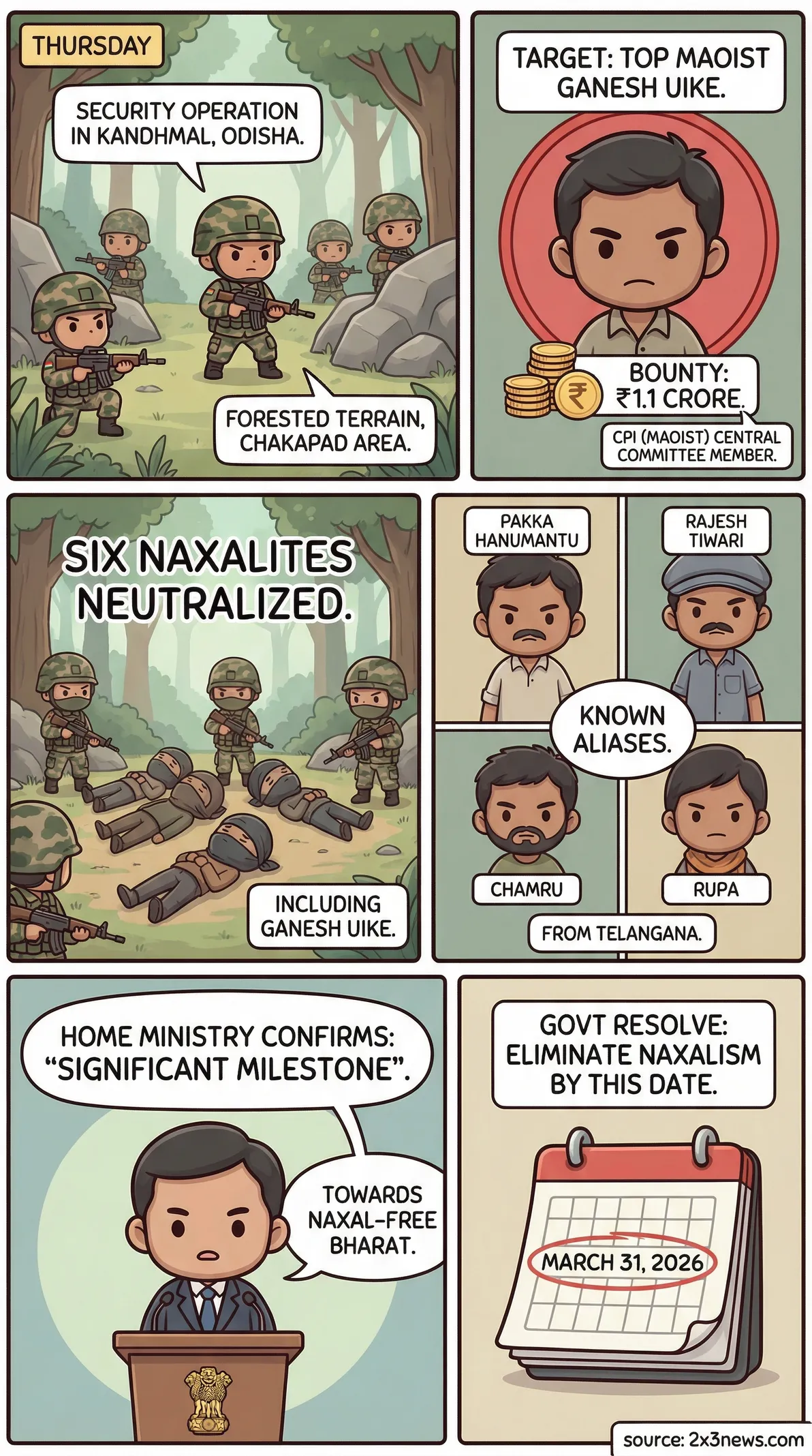 Senior Maoist leader Ganesh Uike and five others killed in a major security operation in Odisha's Kandhmal district, a significant blow to Left-wing extremism.