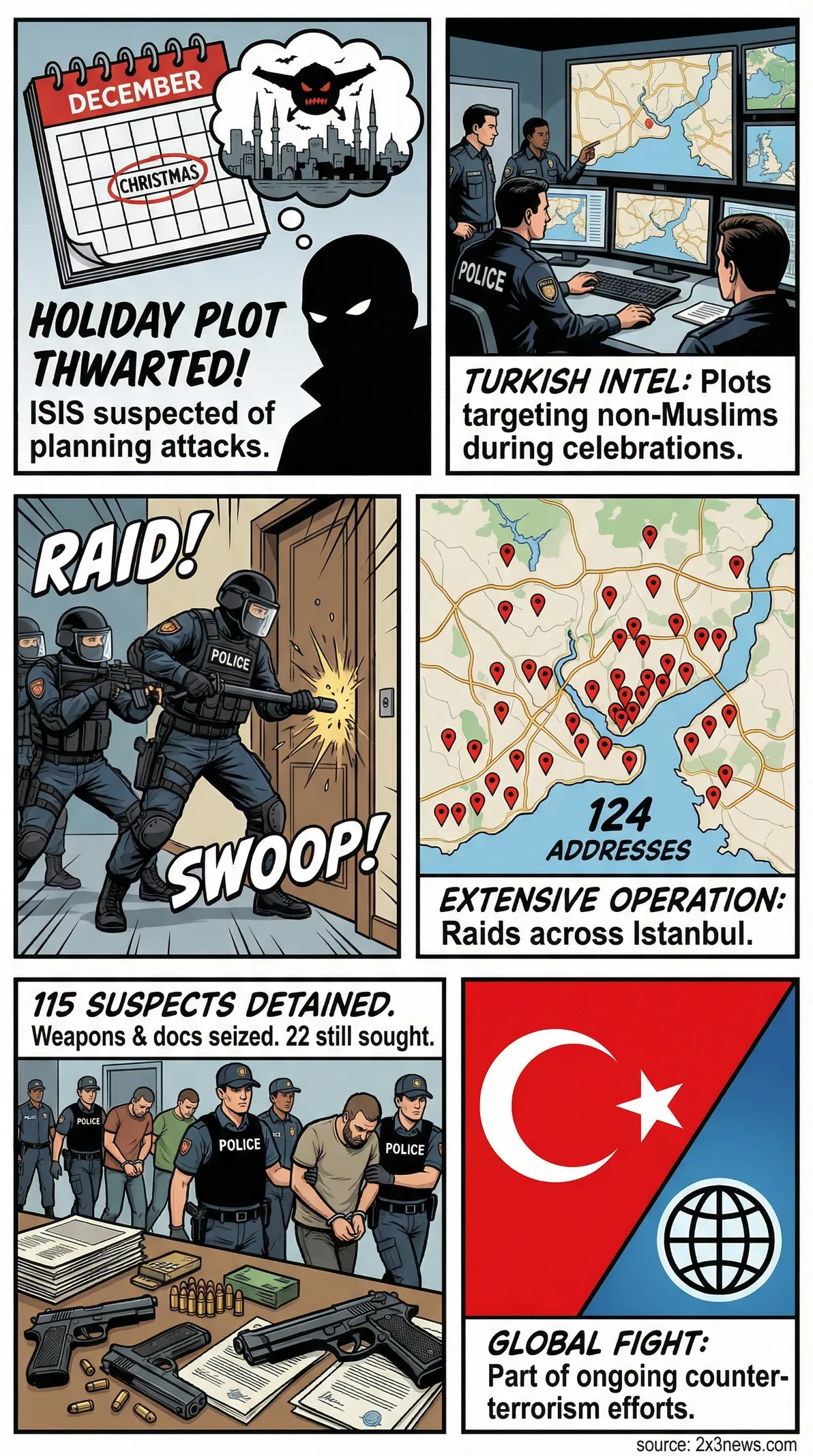 Turkish authorities arrested 115 suspected Islamic State members in Istanbul raids, thwarting alleged Christmas and New Year attacks targeting non-Muslims.